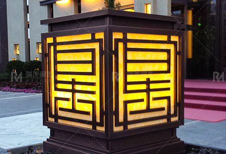 本项目分内嵌壁灯、外挂壁灯、道路引导灯、草坪灯、景观灯等等;铜灯内置 LED 灯,高级云石透光板封闭。内嵌式壁灯为 T2 铜板激光镂空花式,经滚圆、精焊、绿旧仿古等 28 道工序后,高级环保氟碳防护漆喷涂而成。其它灯为国标热镀锌钢管骨架,T2 铜板激光切焊立边,精工拼接复合。
