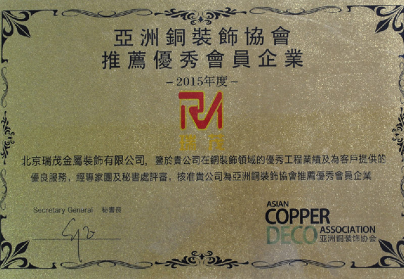 Ruimao Copper Art was founded in 2005, is a copper decoration large-scale enterprises integrating product research and development, production, processing, sales and installation . Company has a complete production line, all kinds of processing and production equipment, and Ruimao in Germany's own brand Heirnch in all aspects of production technology cooperation, all using CNC precision machinery for processing.