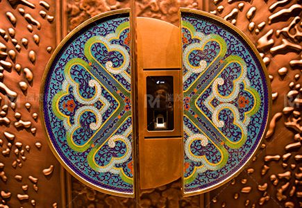 门拉手上的跳色创作使水滴景泰蓝艺术铜门上铜板表面的光影色彩性更丰富