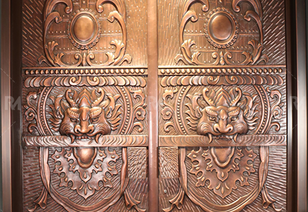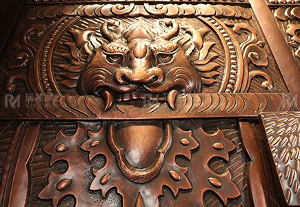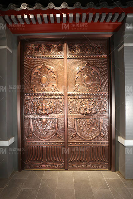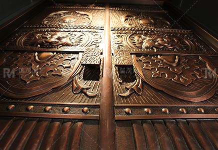 艺术铜门上部为天,下部为地,并将唐代武士铠甲作为设计原素
