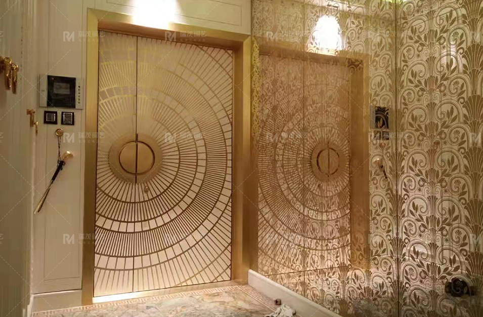 经国家建筑材料检测中心检验,瑞茂铜门的门体安装自主研发的高效保温节能复合门组件,内层具有一定厚度的阻燃保温板,内侧钢骨架加强筋保证门体稳定性,保温、抗击撞击、并且具有良好的密封性能和隔音效果;