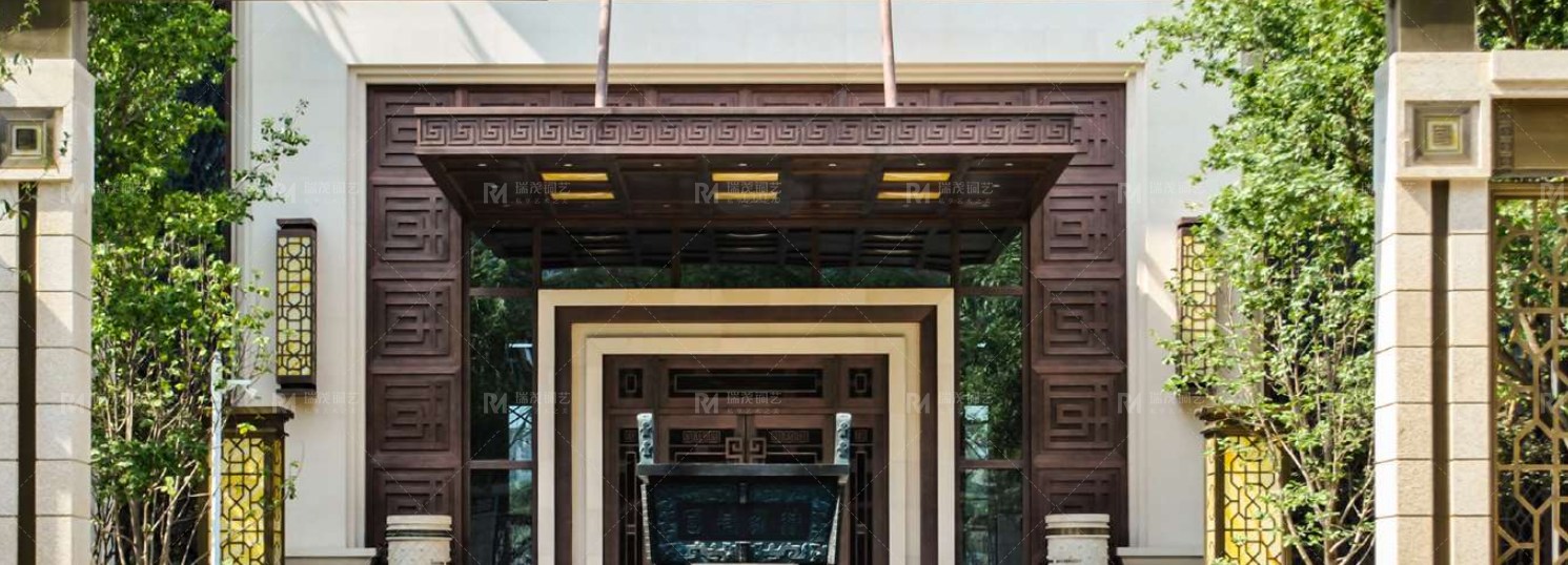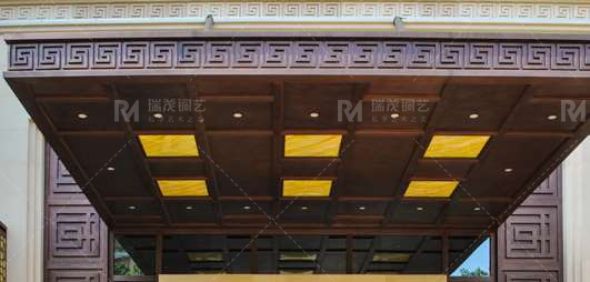 • 雨蓬为铝 蜂窝压合板组合安装,LED 光源,透光石灯罩,雨蓬立面“卐”字花及大门 外套特制“国”字花饰为加厚铜板精工焊接;表面仿古处理,高级环保氟碳 防护漆喷涂。