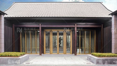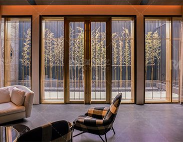 The same floor-standing fixed copper window on both sides, inheriting the classic, atmospheric, elegant and simple design style, showing the beautiful time of symbiosis between thee transparent space and harmonious nature.