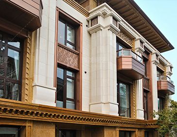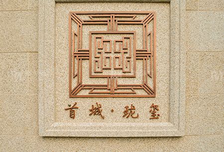 Two-storied building upper and lower one-piece window coverings, with curtain walls on the top and the middle. National standard hot-dip galvanized steel pipe skeleton, aluminum honeycomb lining, T2 material copper plate finish, straight line shape.The vacant part of the curtain wall of the window is 20mm thick pure copper laser hollowed-put flower decoration, with surface antique treatment, and advanced environmental protection fluorocarbon protective paint is sprayed.