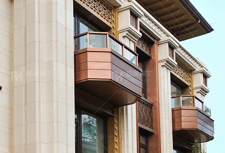 Polygonal shape balcony, national standard hot-dip galvanized steel pipe skeleton, T2 material copper plate finish, aluminum honeycomb lining. The upper part is pure copper profile column, with 12mm tempered glass.