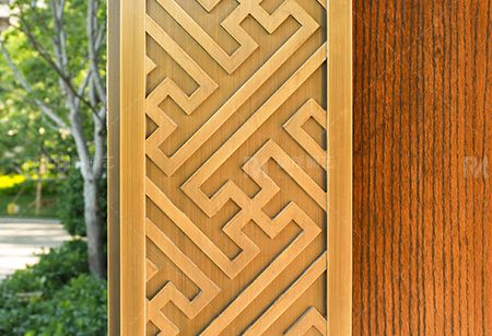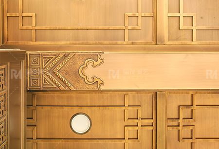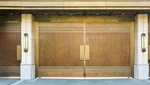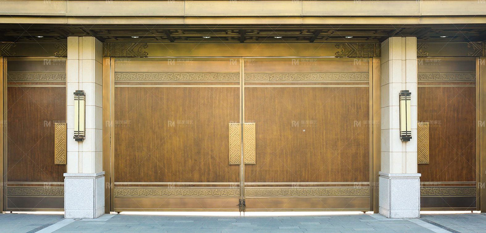 There are a total of 4 gates, vehicle entrance gate in the middle, passenger gates on both sides. National standard hot-dip galvanized steel pipe skeleton, solid wood material finish, H62 material copper plate decoration, special large handle with build-in laser cut 卐 plaque pattern, Chinese strip pure hand-forged embossed fretwork embellishment echos large horizontal beam forged with traditional fancy beam and square column; anti-oxidation antique, advanced environmental protection fluorocarbon protective paint spraying; Italy originally imported fully automatic intelligent swing door system.