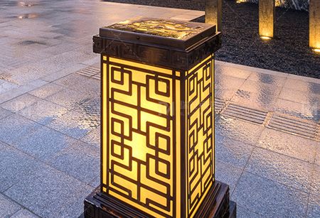 Copper Lamp: Road guide lights, landscape lights, etc.; national standard hot-dip galvanized steel pipe skeleton, copper lamp with built-in LED lights, sealed with high-grade marble light-transmissive plate. T2 copper plate laser cutting with vertical edge welding, precision splicing composite, advanced environmental protection fluorocarbon protective paint spraying.