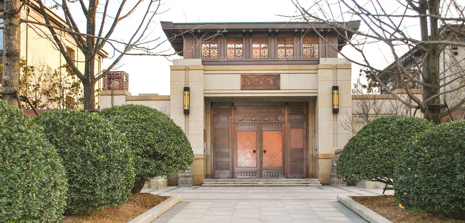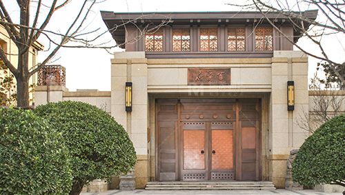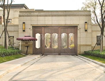 The main entrance and side doors are all made of antique copper, and the main entrance adopts positive etching, with tiger door knocker, and a semi-circular bubble nail. There are a large number of traditional Chinese elements such as rafter head, long copper lamp, etc. The side doors are automatic swing doors, flat plates, lines, and perspective flowers. Designers cling to the theme, showing a low-key luxury that is infinitely thought-provoking. The automatic opening of the courtyard door, the national standard hot-dip galvanized steel skeleton, the surface is attached with precious copper,all hand-assembled, the floral decoration on top of the door is by pure hand-forging process, carefully welded, and the overall design is magnificent, minimalist, yet not simple.