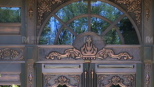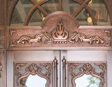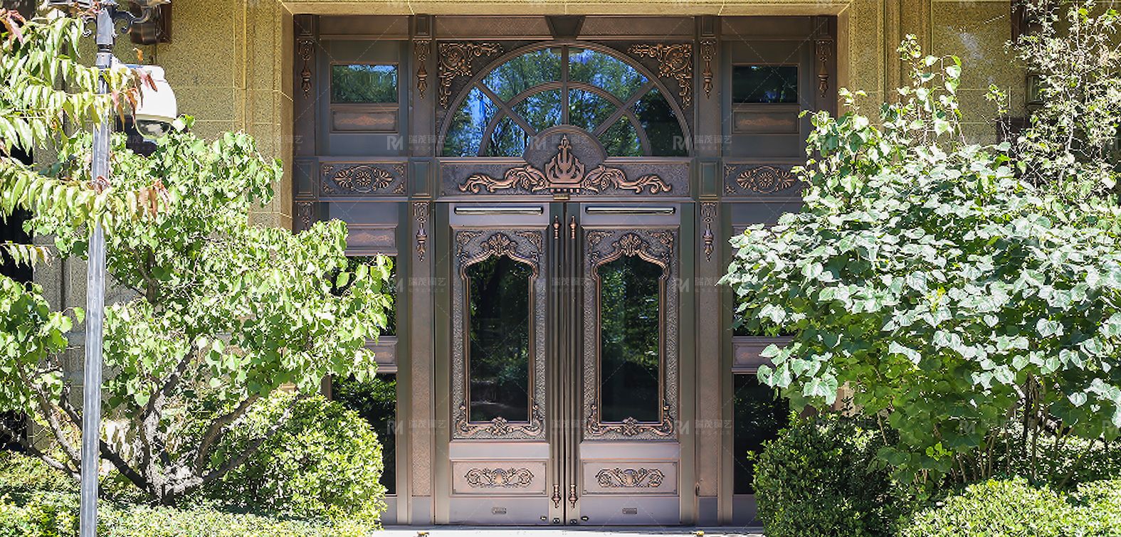 The dignified and heavy Islamic style, as the inspiration for creativity, decorated with rich and exquisite details, makes it the crystallization of fine workmanship, the harmonious combination of square and curved lines, supplemented by Islamic elements, exquisitely etched finishes,and the use of large area hand-forged embossed floral ornaments, all showcases the profound craftsmanship of the long-standing copper technology. The lower part of the door is a solid plate, and the upper part is 6mm+9mm+6mm hollow glass, smart yet with profundity. Roman columns are on both sides, endowing it with same solemnity and grandeur.