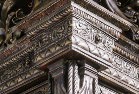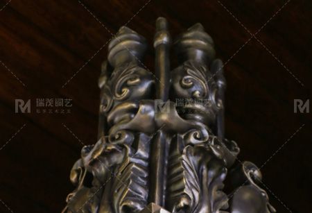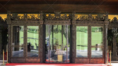 The copper rotary door is of special aluminum alloy skeleton, the side door is of the national standard hot-dip galvanized steel pipe skeleton,H62 copper material profile, special tempered glass; the column and the door flower decoration are made of H60 copper fine casting, and the personalized handle is welded by profile precision technology, with surface antique treatment, sprayed with advanced environmental protection fluorocarbon protective paint.