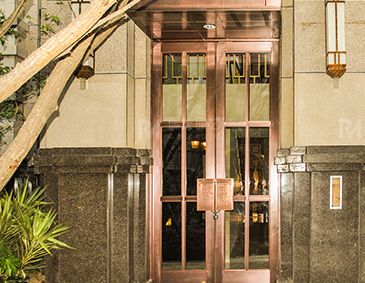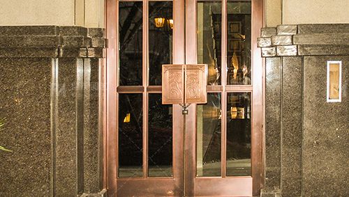 Copper awning: 6mm+6mm laminated glass awning, awning purlin by thickened copper plate welding; surface antique treatment, advanced environmental protection fluorocarbon protective paint spraying.