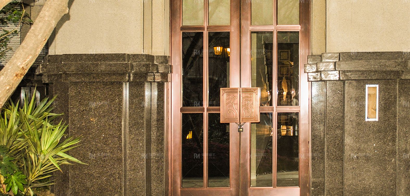 Unit Copper Door: Split opening copper door, with fixed fans on both sides. National standard hot-dip galvanized steel pipe skeleton,6mm+9mm+6mm hollowed-out double tempered safety glass, T2 material copper plate composite, precision processing strip decoration double-sided buckle.