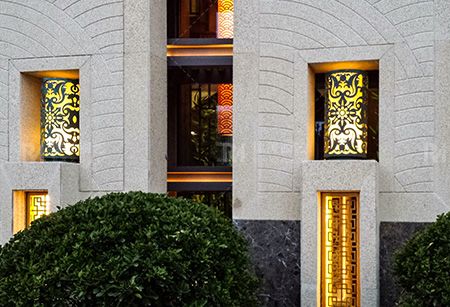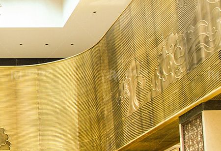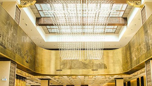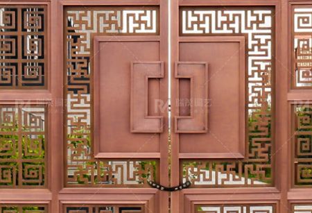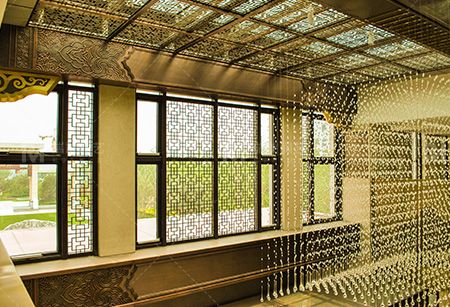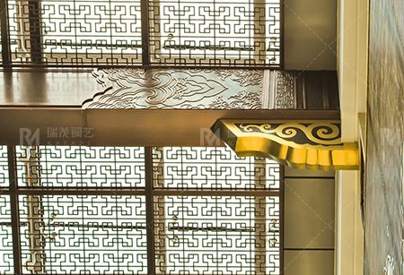 Mainly there are copper window sash, copper partition, ceiling, column decoration,decorative beam, bucket arch, wooden door handle, guardrail, etc.: copper sash, partition, ceiling, column decoration are of 20mm thick T2 copper plate laser hollowing traditional style lattice, surrounded by national standard hot-plating galvanized steel pipe skeleton, T2 material copper plate composite. Decorative beam: T2 thickened copper plate precision welding, beam square-column by pure hand-forged process; bucket arch H62 thickened copper plate pure hand-forging + precision welding production. The wooden door handle is of H62 thickened copper plate laser moiré and double-sided precision welding. The overall guardrail is made of 20 thick customized super-standard plates, precision engraved with water-cloud pattern, surface antique treatment, high-grade environmental protection fluorocarbon protective paint after spraying, on-site splicing.