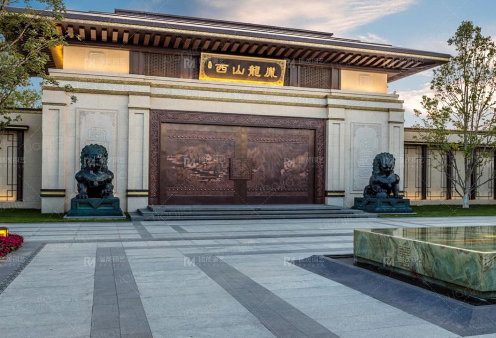 暗藏式平移电动铜门:国标热镀锌钢管骨架,T2 材质铜板饰面,山水画面为特殊蚀刻工艺,门框、门拉手、门腰带花饰为纯手式锻打工艺,单扇 28 颗铜泡钉点缀。表面仿古处理,高级环保氟碳防护喷涂;意大利原装进口全自动智能平移门系统。滑盖拉手内藏密码键盘。